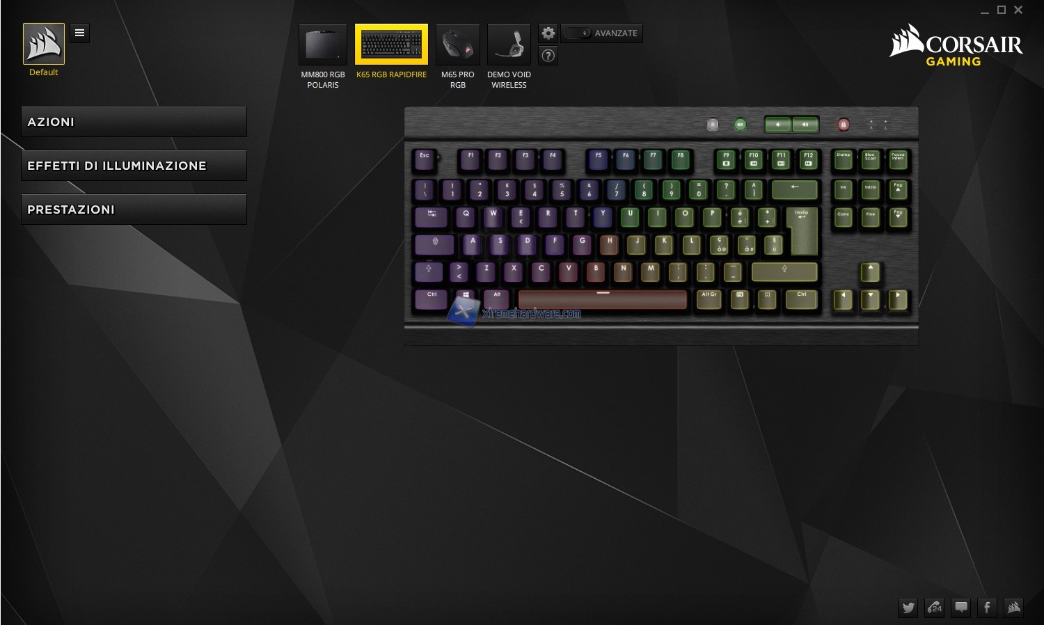 Il Menù principale è quello di Ripielogo dove troveremo anche le immagini/icone delle periferiche collegate e rilevate. In questo caso stiamo utilizzando la tastiera Corsair K65 RGB RAPIDFIRE, il mouse Corsair M65 PRO RGB e il mousepad Corsair MM800 Polaris RGB.