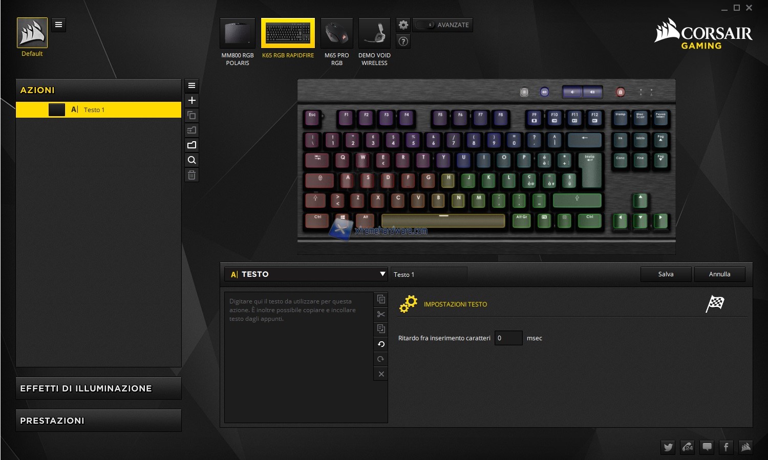 Per la personalizzazione della tastiera invece avremo a disposizione tre Menù ovvero ‘’Azioni’’, ‘’Effetti di Illuminazione’’ e ‘’Prestazioni’’.