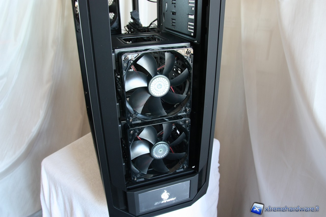 Notiamo anche le ventole adibite al raffreddamento degli hard drive, che troveremo installate dietro al pannello laterale sinistro in modo tale da creare un flusso d'aria omogeneo per smaltire direttamente il calore generato dalle periferiche di memorizzazione, senza influire sul resto del PC.