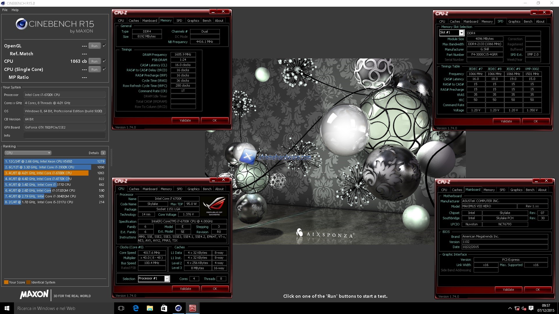 Dato il settore estremamente ampio cui è indirizzata la ASUS Maximus VIII Hero non potevamo esimerci dall’eseguire anche i test in overclock forte del fatto che siamo un portale orientato a questo ampio sport che raccoglie sempre più una vasta schiera di adepti e perché no regala anche delle soddisfazioni riuscendo  con lo stesso hardware ad operare ad una velocità maggiore rispetto a quella di fabbrica, limitatamente dalle possibilità offerteci dal raffreddamento a liquido, per spingere la frequenza nel nostro caso della CPU Core i7 6700K ben oltre la soglia di sicurezza dichiarata da Intel. Il tipo di test scelto per l’efficienza nello stressare il processore è CineBench nell’ultima release disponibile che è la R15. Il test eseguito ovviamente è quello CPU multithreading che spalma su tutti i core logici il calcolo del rendering dei solidi rappresentati nella scena. Solo una piena stabilità ci consente di terminarlo ottenendo il risultato che per quanto semplice sia (basta avviare l’esecuzione dall’apposito tasto) è a livello mondiale una vera sfida con tanto di premio per il vincitore.